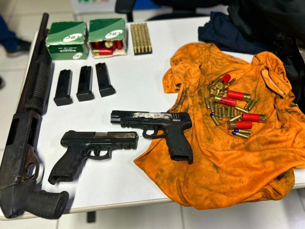 Com o suspeito, foram apreendidos: 1 espingarda calibre 12; 2 pistolas Taurus calibre .40 com numeração suprimida; 3 carregadores de pistola; 56 munições calibre .40; 50 munições calibre 12; 17 munições calibre .38; 6 camisas com identificação da Polícia Civil; 6 calças camufladas; 6 balaclavas; e 1 camisa térmica.